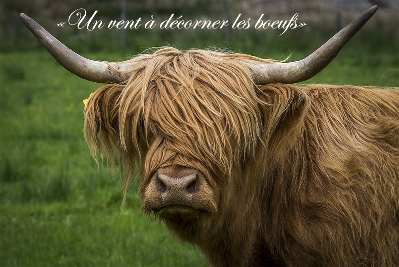 Comme j’ai eu l’occasion de vivre quelques jours en compagnie d’un cyclone lors de son passage à La Réunion, l’expression « Un vent à décorner les bœufs » était toute trouvée :