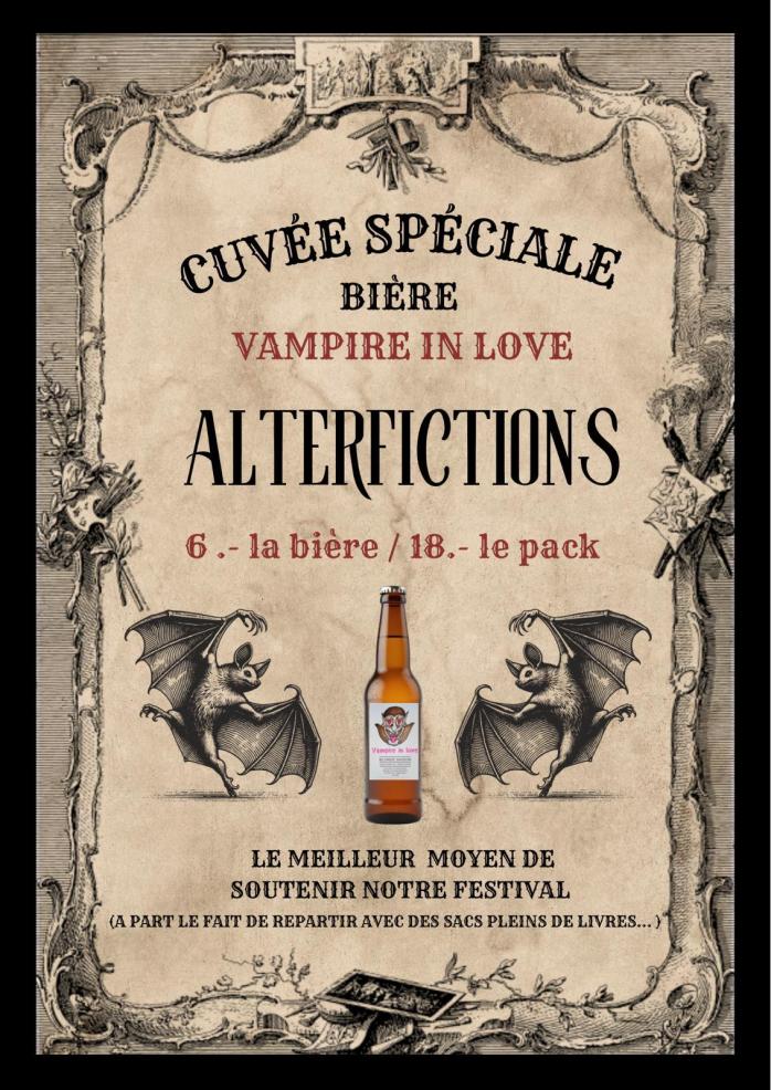 Et si la littérature ne vous suffit pas (ou si vous aimez simplement joindre l’agréable à l’agréable), ne repartez pas les mains vides ! Savourez notre cuvée exclusive, spécialement brassée pour Alterfictions, et soutenez en même temps notre association d’auteurs. Une manière originale de prolonger l’aventure du festival… à petites gorgées littéraires !