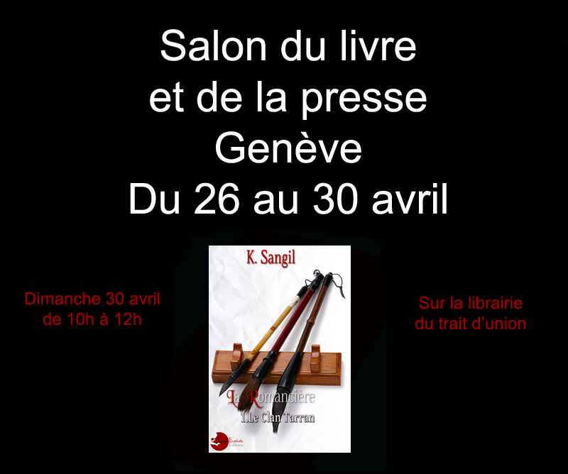 Le salon du livre et de la presse aura lieu du 26 au 30 avril 2017. Retrouvez- moi en dédicace sur la librairie du trait d’union, le dimanche de 10h à 12h. 31e salon du livre et de la presse de Genève